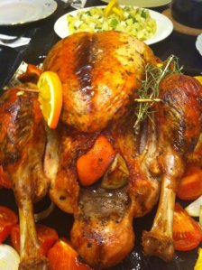 Finally after four and a half hours in the oven our turkey was ready to come out. Stuffed with garlic, onions, orange, thyme and bay leaves, this baby was looking delicious.